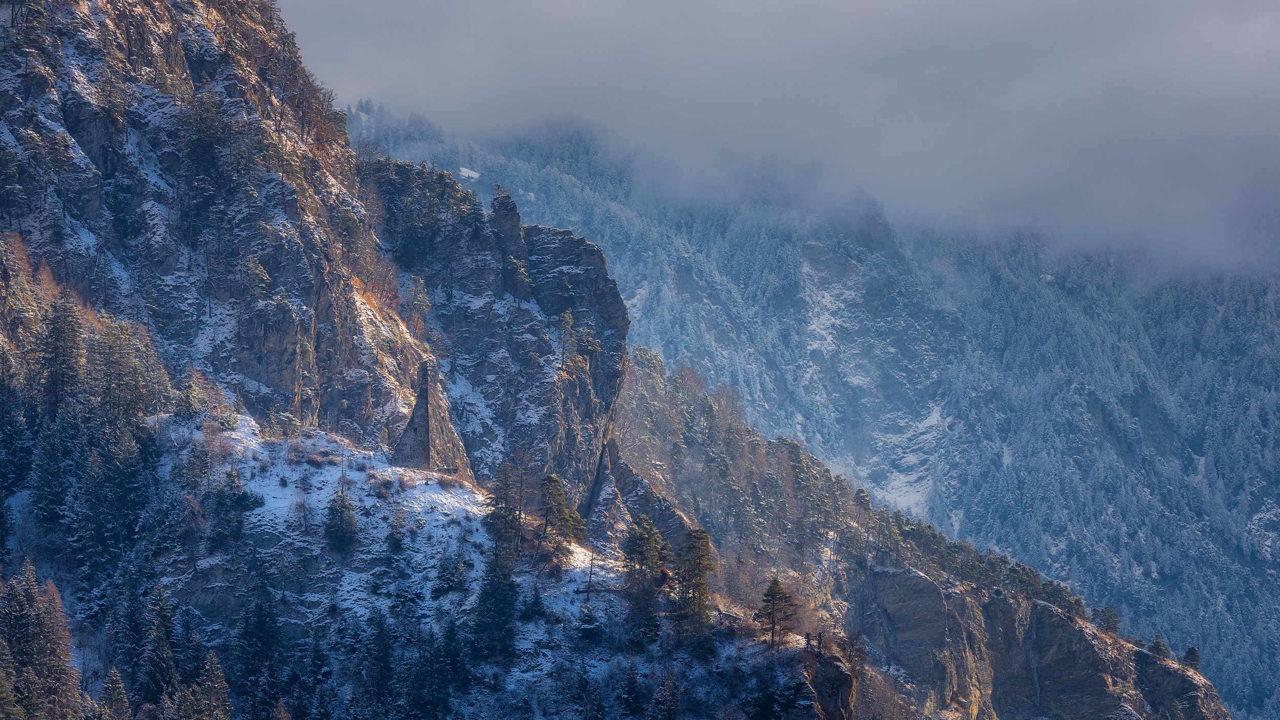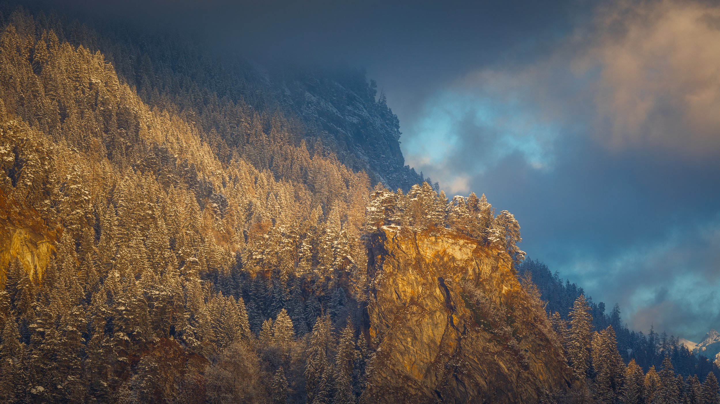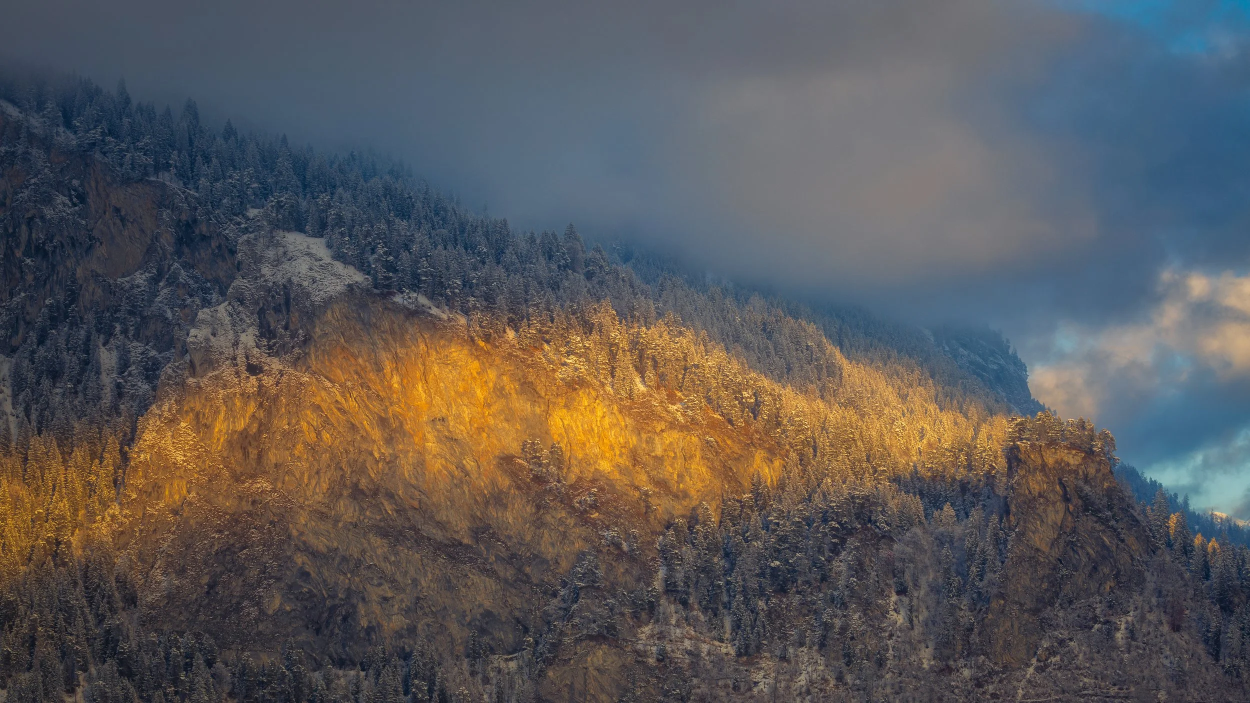 What fascinated me most about this composition was the contrast between elements. The cold blues of the shaded forest against the warm sunlight hitting the snow. The heavy clouds pressing down from above, while the light quietly carved out structure within the landscape.